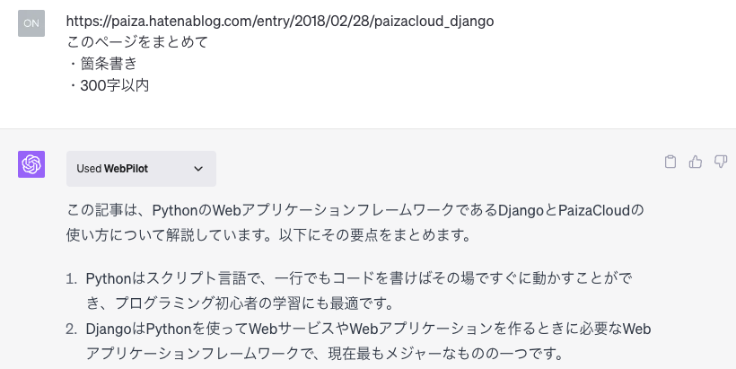 次に要約です。Webページの要約はWebPilotプラグインを使います。パッと概要をつかみたいときに使えそうです。要約したのはDjango3入門: 初心者でも10分でWebサービスを作れる!PythonフレームワークDjangoとPaizaCloudの使い方。
