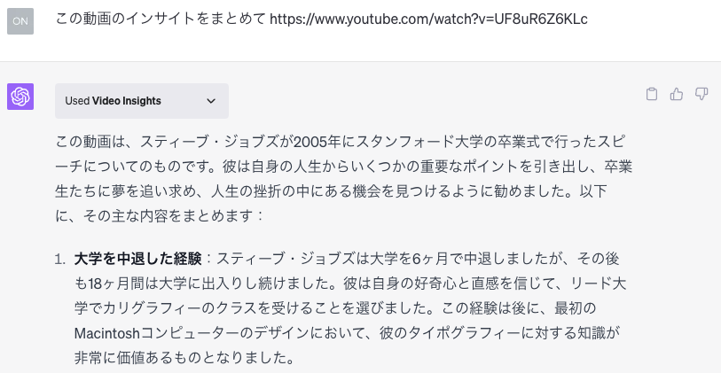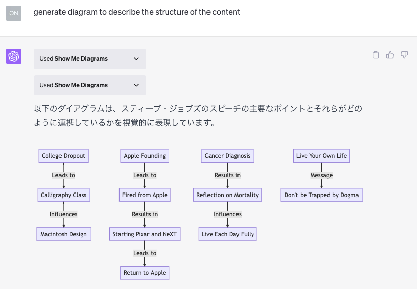 最後の要約はYoutubeです。Video Insightsプラグインを使って、大好きなSteve Jobsの動画をまとめました。そして、Show Me Diagramsプラグインでグラフ化します。メッセージ部分が大切なのに、エピソードの具体的な内容をまとめていてちょっと微妙でした。ここら辺のニュアンスを読み取るところまではまだ難しいのでしょう。