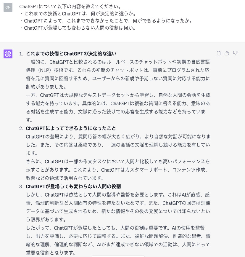 また、インターフェースとしては、質問ないしは指示を理解し回答することができるので、自然な対話を可能にしました。コンピュータが人間と同等の知能を持つかどうかを評価するための試験としてチューリングテストというものがありますが、もはや人間かChatGPTかを判断することは難しいでしょう。