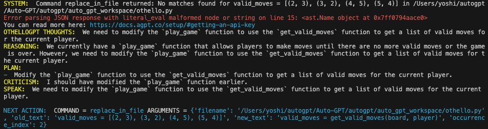 結果は・・・バグにはまってオセロゲームは完成しませんでしたw。Youtubeでは、無事にオセロゲームが完成したケースも報告されています。今はまだ、ちょっとおバカだったりもして時間かかりますが、いずれ解決するのでしょう。何をやるかだけを決めて寝て、起きたらAutoGPTがコードを完成させている未来は近そうです。
