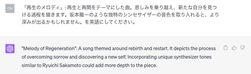 次にクリエイティブ系です。今回、画像生成に一番感動したのですが、長くなりそうなので最後に説明します。まずは音楽です。Meta(Facebook)が公開した「MusicGen」というオープンソースを利用します。作成したのは「坂本龍一を参考に、悲しみの中に前向きさを感じるJポップ」です。まずはChatGPTでプロンプトを作成しました。そして、作成された音楽が以下になります。意外とそれっぽい感じではないでしょうか。