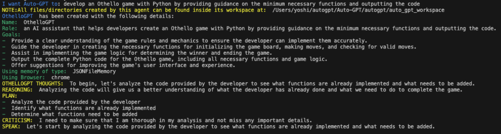 最後にプログラミングです。まずは自動AI「AutoGPT」です。何が凄いかって、目的を与えるだけで、どのタスクが必要かを考え、Web検索を含めて実行し(ここではWebでオセロのルールを確認して)、プログラミングを作成し、テストするところまで自動でやってくれます。ここではオセロゲームをPythonで作成してみることにします。