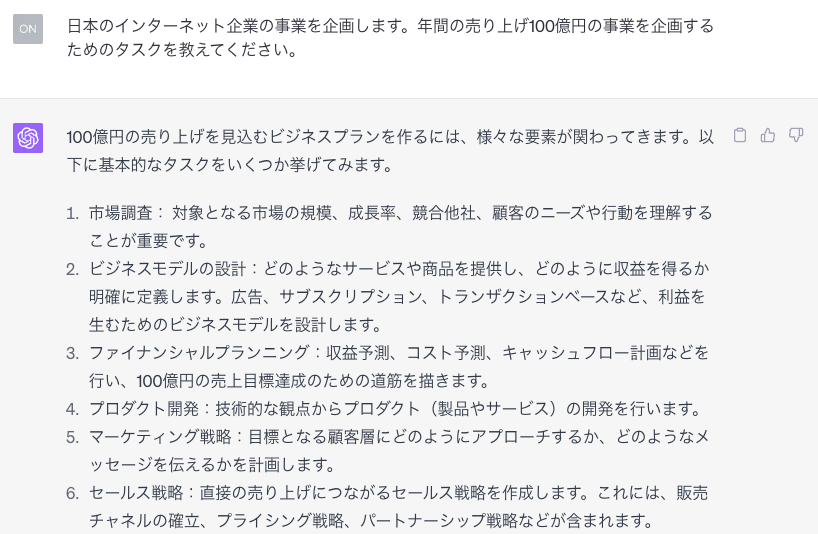 まずは年間売上100億円の事業を企画するためのタスクを作成してもらいました。それっぽい。