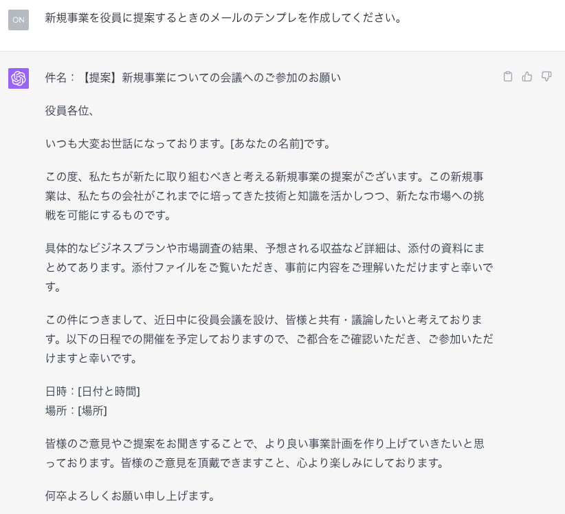 ついでに新規事業を役員に提案するメールを書いてもらいました。自分よりちゃんとしてる。
