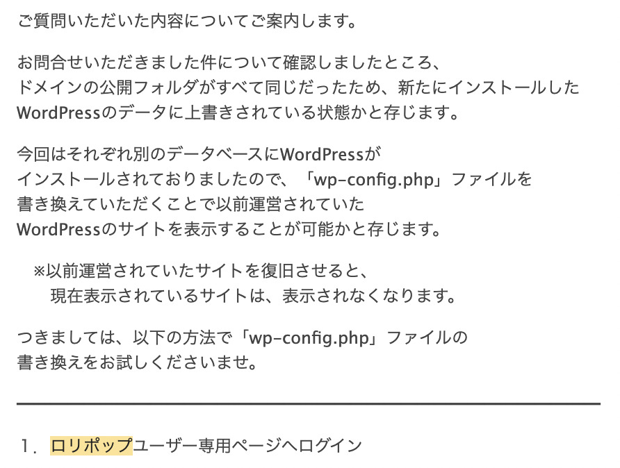 今回の失敗では、「公開フォルダ」を設定しなかったことが原因で、旧WordPressが表示されなくなりました。ただ、運よく利用データベースは新規作成していて、旧WordPressのデータベースは残っていたので「wp-config.php」ファイルを書き換えることで、旧WordPressが復活しました。カスタマーサービスの対応が適切で素晴らしかったです。