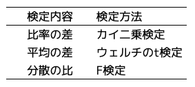解説ポイント2点目は、バナーAとバナーBに効果の差があるかを検定したカイ二乗検定についてです。ユーザー登録のように登録したか登録しないか、つまりユーザー登録が1か0の値を取るものについては、カイ二乗検定で独立性を検定することができます。ここは理解するというよりも、そういうものだと一旦受け入れてしまった方が早いと思います。少しだけ補足すると、独立とは「バナーAとバナーB」と「ユーザー登録の有無」に関係がないということを意味して、独立性がない=バナーAとバナーBの効果に差がある、と考えます。カイ二乗検定を含め、検定したいこと(検定内容)と検定方法の対応表を記載しておきます。
