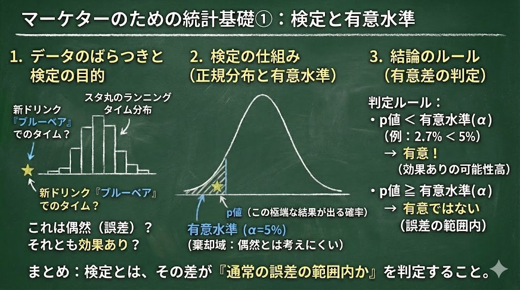 今回はここまでです。スタ丸の例で、有意性検定のイメージは伝わりましたか。データには散らばりがあり、通常の誤差か意味のある差かを有意性統計で判定する、通常かどうかのしきい値は有意水準として設定する、というところがポイントです。次回は、マーケティング施策の検証によく使うCVRのカイ二乗検定について解説します。