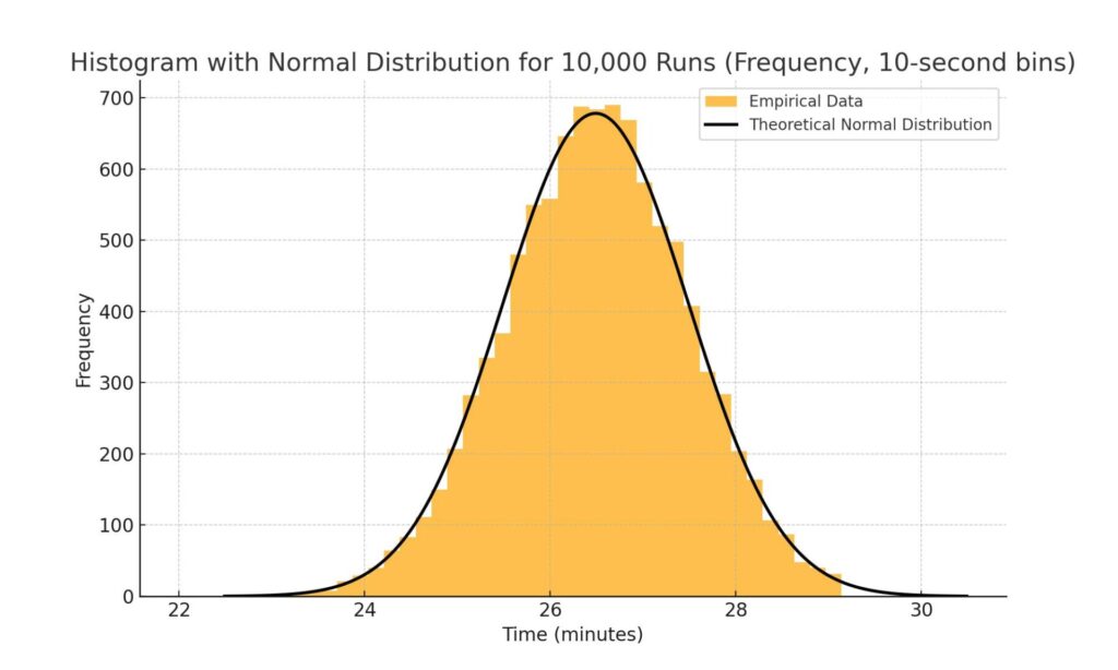 なお、サンプルサイズ(今回だと走った回数)が増えると、正規分布(ガウス分布とも呼ばれます)に近づくという定理(中心極限定理)があります。実際、先ほどの10000回のヒストグラムに正規分布の曲線(黒の太線)を追加すると、よく当てはまっていることが分かります。