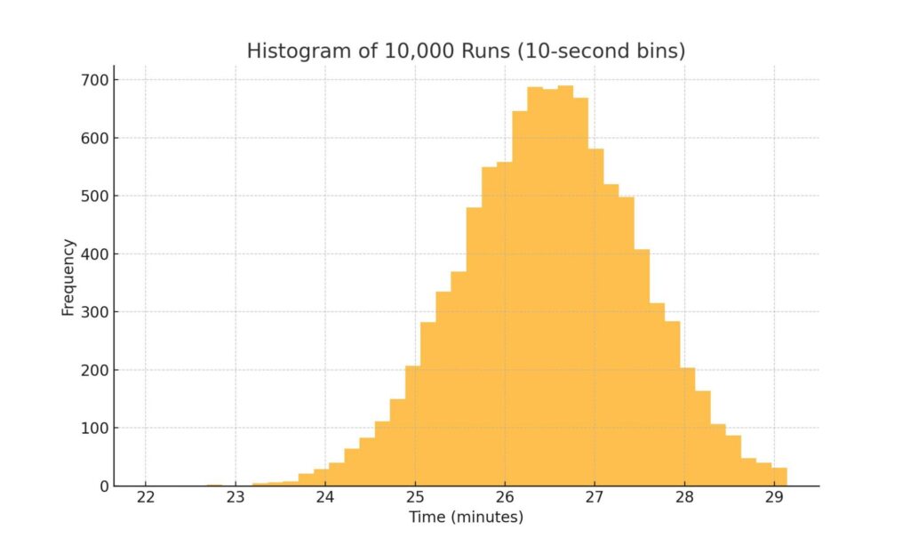 具体例で説明していきましょう。スタ丸に(スペシャルドリンクを飲まずに)10000回走ってもらうことを考えてみます。ヒストグラムは以下のとおりです。普通に10000回走ってみて、早いものから5%のタイム(10000回中500番目のタイム。5%点や5百分位点といいます)より早ければ、通常の誤差ではなく、スペシャルドリンクに効果があるという判定方法が考えられます。ブルーベアを飲んだときのタイム(24分54秒)は、5%点の25分9秒より早いので、ブルーベアには早くなる効果がある、といった感じです。