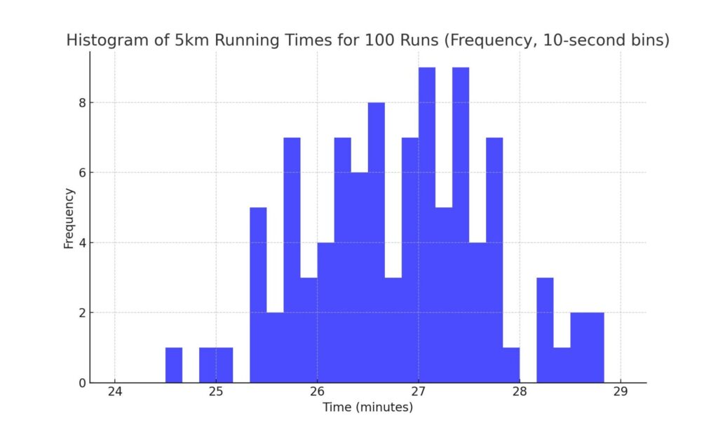 具体例を挙げながら説明していきます。スタ丸は、メガベンチャーに勤める、25歳のマーケターの男性です。ランニングが趣味で、5kmのタイムを28分4秒、24分52秒・・・と100回計測し、タイム毎の回数をまとめたのが次のヒストグラムです。ヒストグラムの見方は、例えば27分20秒~30秒が9回あったというもので、つまり10秒刻みにしたときの回数をグラフにしたものです。このようにデータは通常散らばります。
